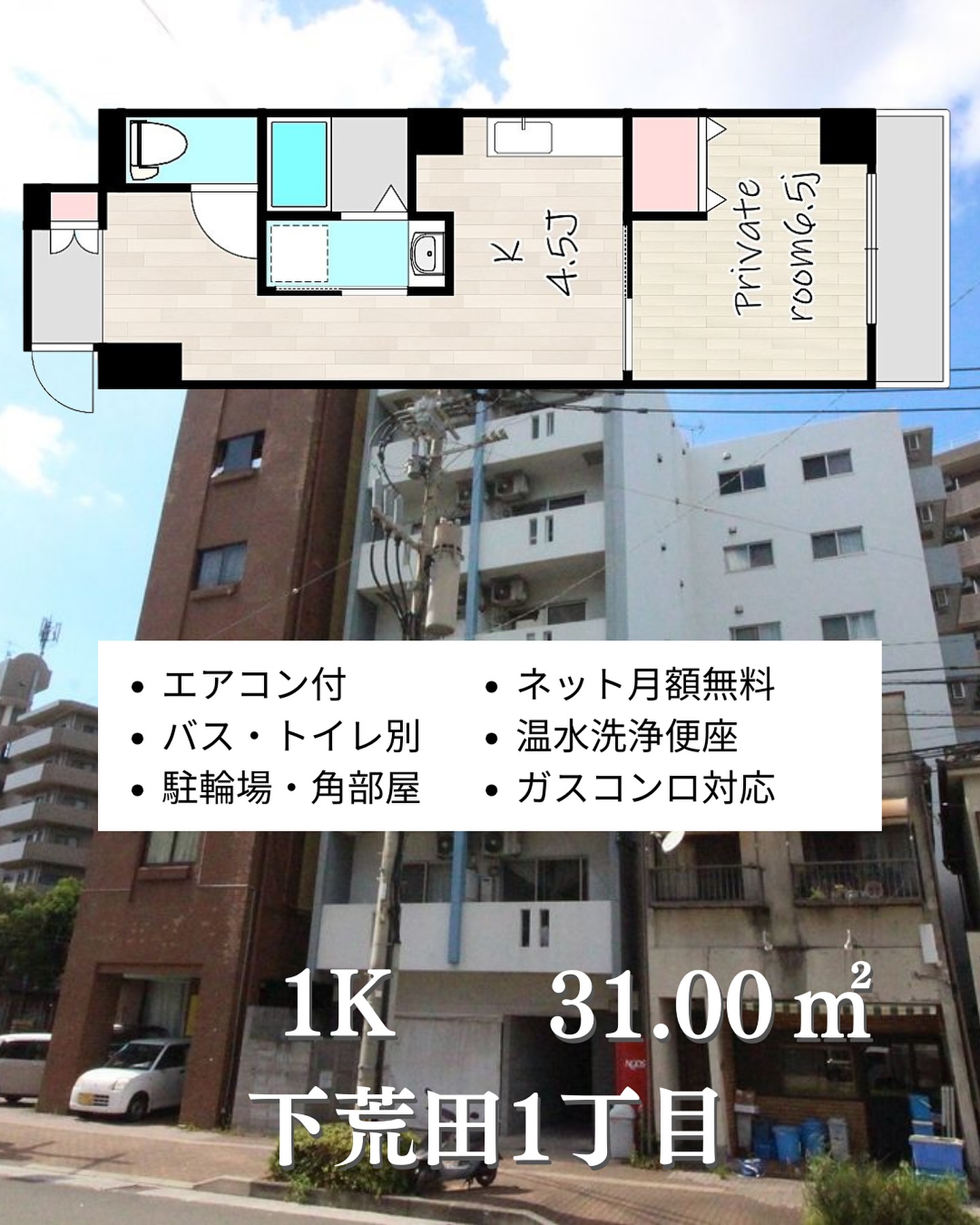 ▷ 間取り :1K (K4.5, 洋室6.5)