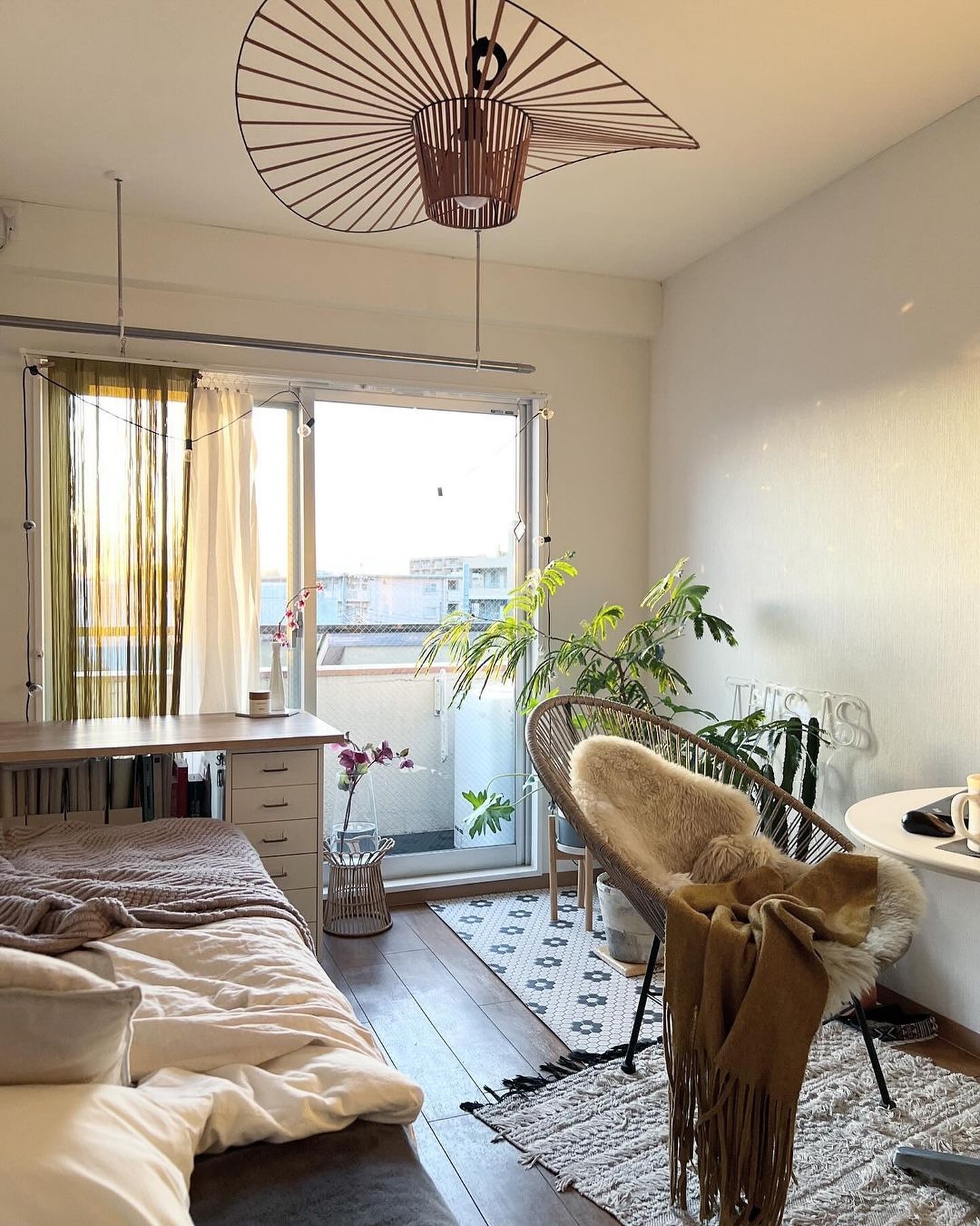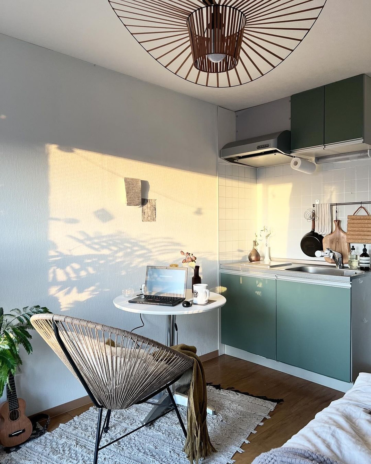 日が当たって観葉植物の影がさらにお部屋の雰囲気を良くしていて素敵です